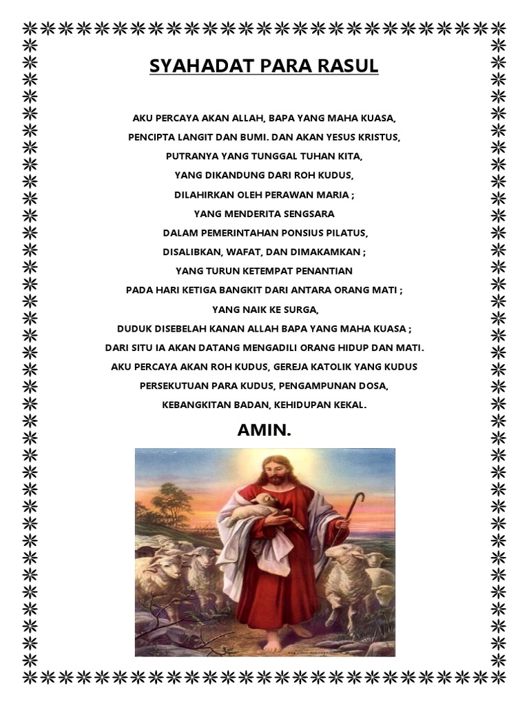 Doa aku percaya/syahadat katolik bahasa arab. Aku percaya akan allah, bapa yang maha kuasa, pencipta langit dan bumi. Aku percaya kepada roh kudus, gereja yang kudus dan am, persekutuan orang kudus, pengampunan dosa, kebangkitan orang mati, dan hidup yang kekal. Aku percaya akan roh kudus, ia tuhan yang menghidupkan; Syahadat ini juga dikenal dengan doa aku percaya. Aku percaya akan allah, bapa yang mahakuasa, pencipta langit dan bumi; Untuk lebih mendalami setiap ibadah yang dilakukan, anda perlu mengtahui dan menghafalkan beberapa doa di bawah ini. Doa aku percaya katolik bahasa batak. Doa aku percaya katolik bahasa batak. Doa adalah bentuk ketaatan seseorang kepada tuhan. Yang turun ke tempat penantian pada hari. Dan akan yesus kristus, puteranya yang tunggal, tuhan kita . Doa aku percaya katolik bahasa batak.